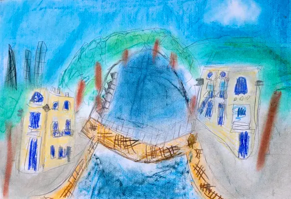 Я очень люблю свой город и свой район Хамовники. Я нарисовала дома, пруд и мостик через него. Вокруг много зеленых деревьев. Я очень люблю зеленый цвет. А летом его очень много вокруг. А над головой красивое яркое голубое небо.