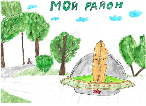 Нарисовала свой любимый парк в районе — парк 30-летия Победы. Мы очень любим гулять там с родителями. Там очень много памятников, есть настоящий танк и фонтан.