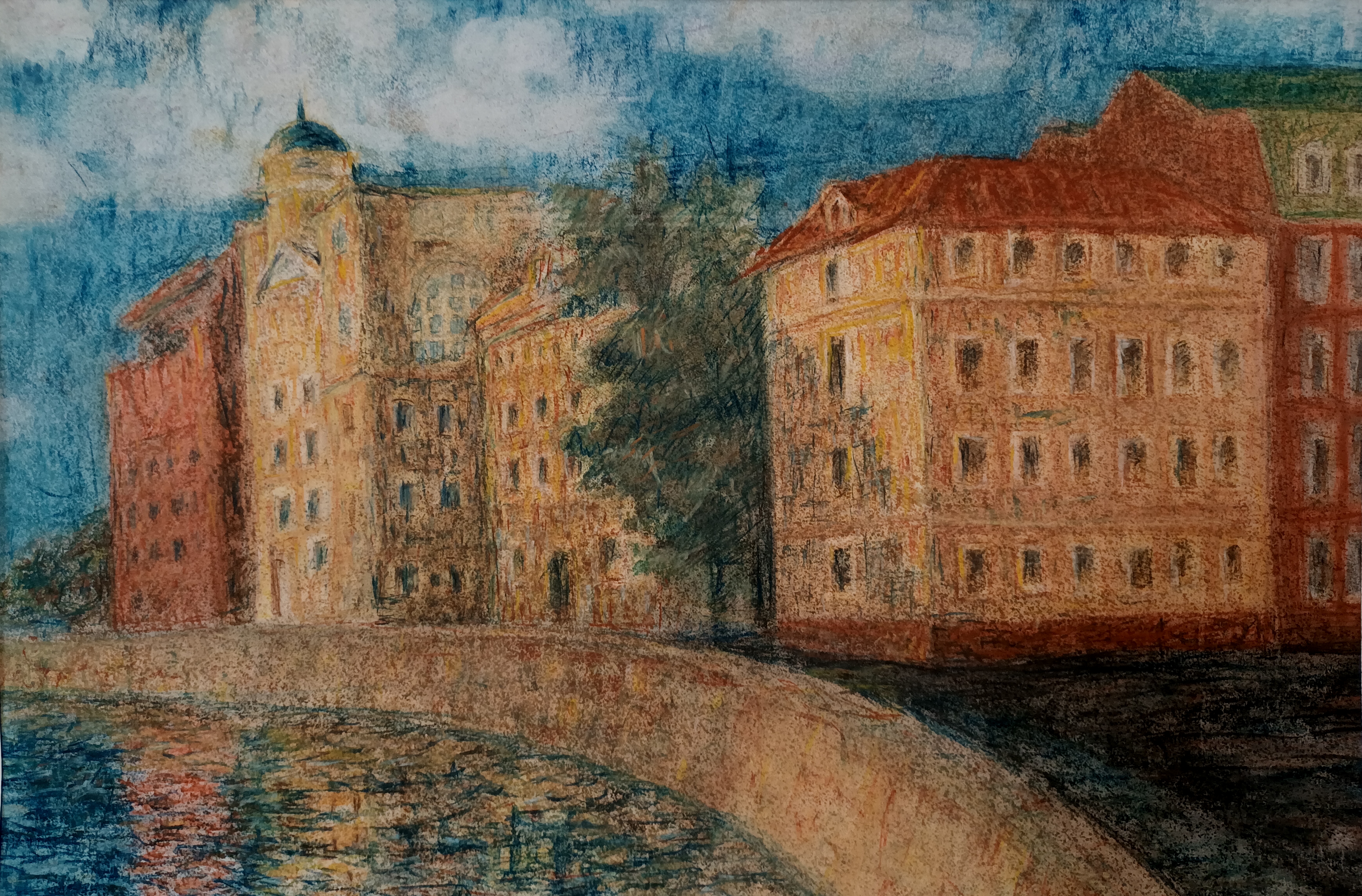Меня зовут Лебзяк Екатерина и мне 17 лет. На картине изображены дома на острове Балчуг, именно тут с родителями я часто гуляю , а также с моими друзьями.