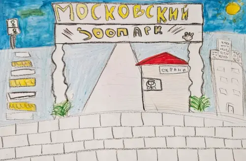 Рисунок «Московский зоопарк» показывает вход в любимое место, где можно увидеть много разных животных. На входе висит большая вывеска, а рядом стоит домик охраны. Зоопарк всегда рад гостям, и здесь можно весело провести время всей семьей, гуляя и узнавая много нового о животных.