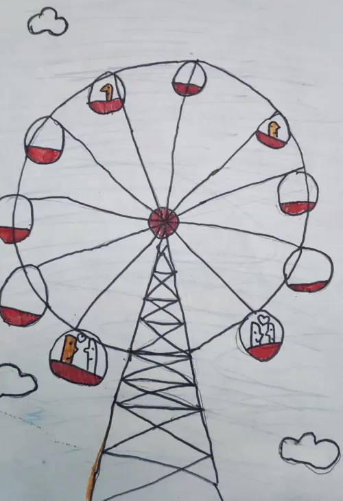 Работа выполнена карандашом и фломастерами на листе А4. Работа показывает, как люди счастливы, когда вместе. Неожиданная встреча в парке на любимом аттракционе может создать большую и крепкую семью.