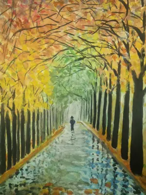 Я не очень люблю осень, потому что холодно и сыро. Но в один день мама предложила прогуляться и мы пошли в Измайловский парк. Изначально я не очень хотела идти, но когда пришли в парк мне понравилась атмосфера. Было тихо, не было даже ни малейшего ветерка. И в лужах под ногами отображались деревья. Этот момент и отображен в данной картине.