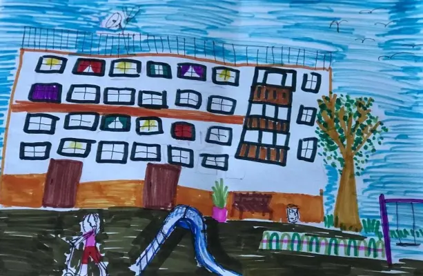 Елизавета изобразила свой двор, в котором она любит гулять, но сейчас на нем едет ремонт и гулять там, пока нельзя. Ждем новую площадку, а пока катаемся на самокатах.