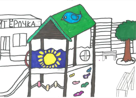 На рисунке изображена детская площадка, на которой обычно собираются много детей и весело проводят время. Мне хотелось отобразить то место, где я играю, веселюсь и нахожу новых друзей.