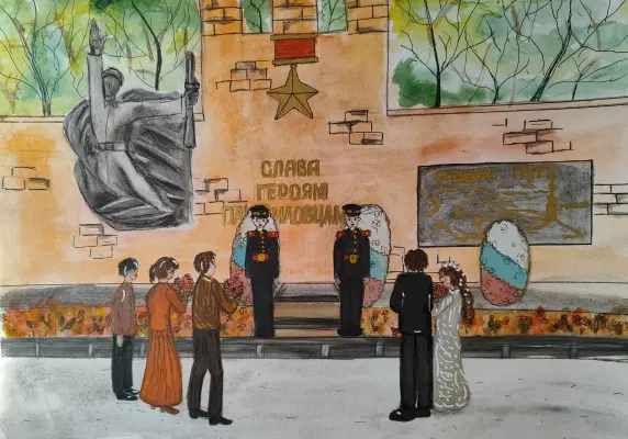 Анастасия на своем рисунке изобразила момент возложения цветов молодоженами к Памятнику Героям-панфиловцам, подчеркивая тем самым важность памяти событий Великой Отечественной Войны.