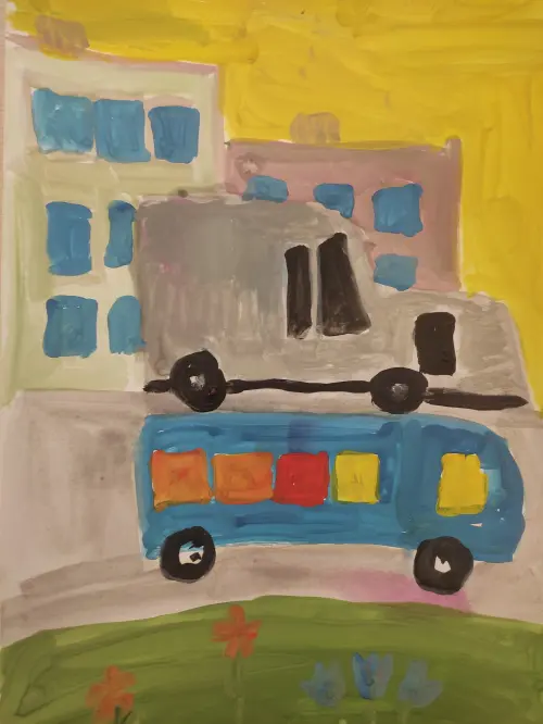 Марк нарисовал машину и грузовик, которые едут по дороге. На Дальнем плане видны дома. Впереди клумба с цветами. Небо над городом жёлтого цвета, чтобы было не скучно.