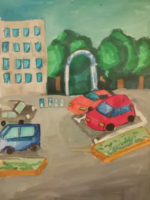 Тихон нарисовал машины на парковке во дворе, клумбы с травой и дом. Для рисунка использовал акварель и скетч-маркеры. На дальнем плане парк и ворота. Получился красивый образ московского двора.