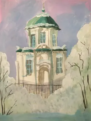 Я нарисовала очень красивую церковь на улице Лазо. Я выбрала зимнее время года, так как заснеженные деревья и церковь смотрятся очень красиво. Работа выполнена гуашью и акварелью.