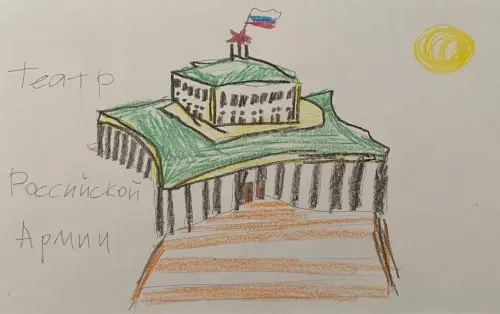 Мне нравится, что в театре всё такое необычное и сказочное. Я всегда с нетерпением жду новых спектаклей и надеюсь, что ещё много раз пойду в театр Российской армии! Я нарисовал театр Российской армии! Он очень большой и красивый! Там высокие стены, а на крыше купол, как у настоящего дворца! А ещё у него есть большие колонны, как в старинных книжках про древних римлян!