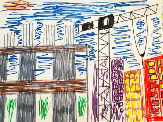 Недавно под окном началась стройка, а Саша очень любит стройки и хочет стать строителем, каждый день он изучает процесс строительства из окна и решил нарисовать свой любимый вид из окна.