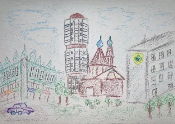На рисунке изображен мой район. В нем я живу и очень люблю гулять по его улицам и скверам.