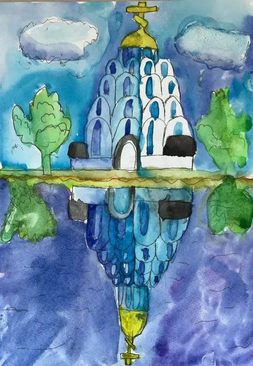 На картине изображен красочный вид из родного дома на Тушино. На заднем плане видны зеленые деревья и лазурно-голубое небо. В реке отражаются облака и деревья, создавая красивый отражающий свет.На картине изображен красочный вид из родного дома на Тушино. На заднем плане видны зеленые деревья и лазурно-голубое небо. В реке отражаются облака и деревья, создавая красивый отражающий свет.На картине изображен красочный вид из родного дома на Тушино. На заднем плане видны зеленые деревья и лазурно-голубое небо. В реке отражаются облака и деревья, создавая красивый отражающий свет.