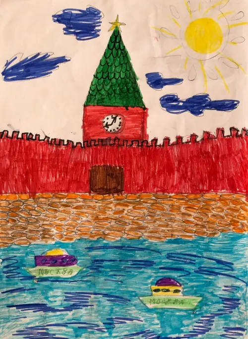 Я нарисовал Кремль и то, насколько бдительны подводные лодки, плавающие вокруг и постоянно защищающие его от врагов. Кремль, как и весь центр столицы, прекрасен!