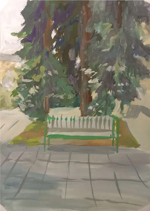 Летная природа парковых зон нашего района, на картине изображено дерево, лавочка, дорожка. Изображен солнечный денек, газоны. Ярко светит солнце, тень от дерева.