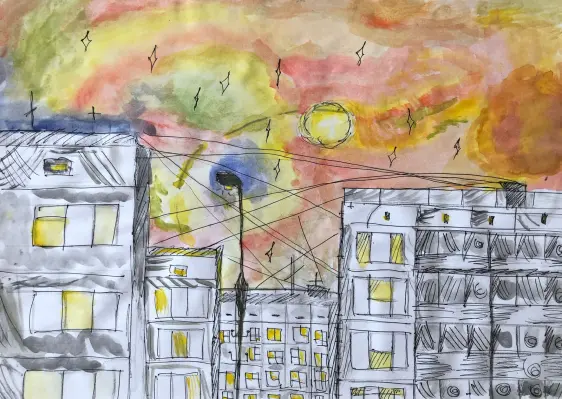 Я изобразил, как усталое солнце поздним летним вечером неторопливо собирается ложиться спать. После того, как оно сядет за горизонт, следом ляжет отдыхать и вся столица