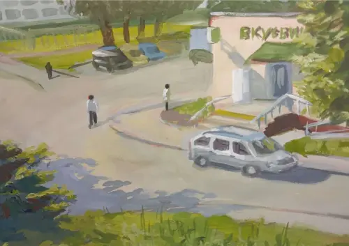 Вид из окна на нашу улицу. На картине изображены автомобили, магазин, прохожие, гуляющие вдоль улицы, жилые здания, растительность, деревья. Ясный солнечный день.