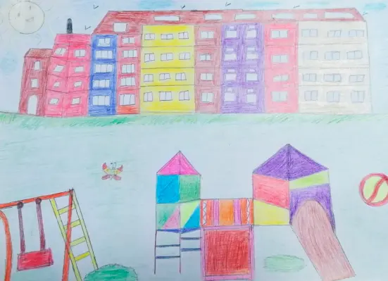 Я нарисовала детскую площадку, которая находится в моем дворе. Мы с мамой и братом гуляем там каждый день. На площадке новые качели, красивая горка, песочницы и много всего интересного.