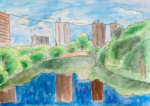На своем рисунке я изобразил пруд, увиденный во время прогулки по одному из районов любимой Москвы.