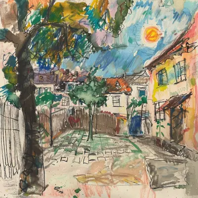Наш двор огорожен забором, чтобы не влезали посторонние. Он заасфальтирован, но в нем оставлены клумбы с землей. На них мама посадила цветы: розы, пионы, тюльпаны, хризантемы и георгины.