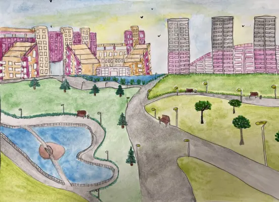 Работа выполнена акварелью. Я изобразил современное Ходынское поле с прекрасным парком, спортивным площадками, живописными прудами, зелеными насаждениями.