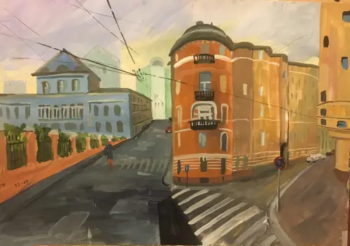 Когда пришло время по программе писать пейзаж, преподаватель предложила мне выбрать значимое для меня место и я сразу решила рисовать Фролов переулок, здесь недалеко находилась моя школа, сам переулок старинный, очень тихий, мне всегда нравилось идти им после школы. Я живу в Раменках, но Красносельский район тоже мне очень нравится!