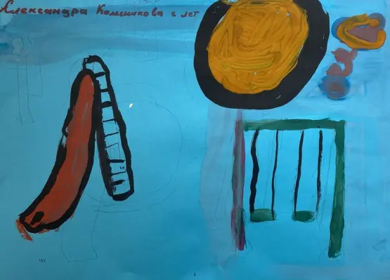 На этом рисунке есть мои любимые качели. Это моя самая любимая площадка. Там есть песочница в которой играют дети. И горка. На этой горке я очень сильно люблю кататься.