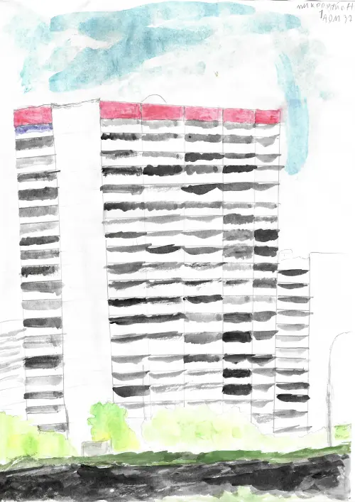В своей работе я изобразил дом № 37 в мкр.1 города Московский, ТиНАО. В моем городе мне нравятся многоквартирные дома, каждый дом — это отдельная история, полная тайн и неизвестных людей. Мне нравится строгие, четкие формы домов, разнообразные фасады зданий, на контрасте с природой, а в Московском много зелени, что в совокупности создает интересные композиции. Также наш город стремительно растет с каждым годом, и многоквартирные дома в Московском отражают динамику, ритм, разнообразие жизни в большом городе.