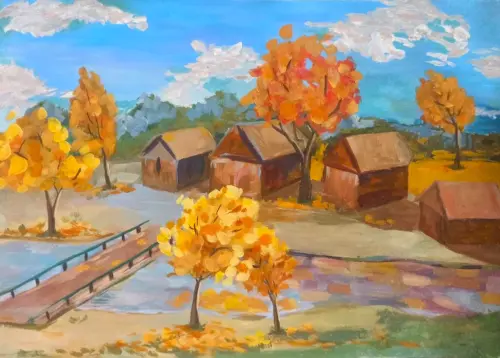 На картине изображена осенняя деревня, покрытая яркими красками осени. На переднем плане видны красочные деревья с оранжевыми, желтыми и красными листьями, которые блестят на солнце. Картина наполнена уютом, умиротворением и любовью к своей Родине.