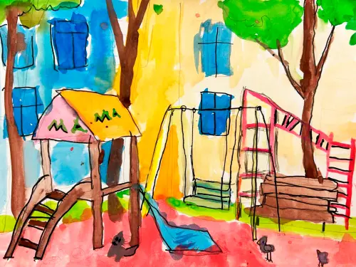 Мой двор очень красивый, там есть горка, качели, лестница, скамейка. Я каждый день люблю гулять в своем дворе и поэтому нарисовал его. Я люблю рисовать.
