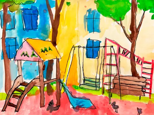 Мой двор очень красивый, там есть горка, качели, лестница, скамейка. Я каждый день люблю гулять в своем дворе, и поэтому нарисовал его. Я люблю рисовать.