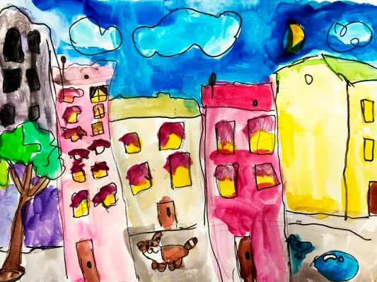 Мой рисунок посвящен району Басманный. В нем много старых и красивых домов. Еще я люблю кошек и всегда наблюдаю за ними во дворе. Поэтому на моем рисунке дома и кошка.