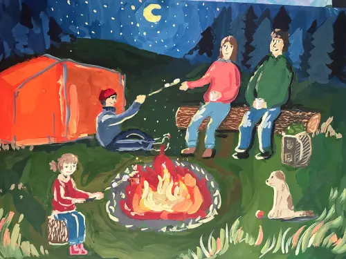 Прошлым летом мы с родителями, моей сестрой и собакой выбирались на природу, грелись у огня, рассказывали интересные истории и пели песни, я научился сам собирать палатку и помогал разводить костер