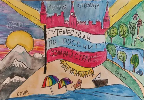 Картина «Путешествие по России» — это увлекательное и познавательное исследование различных регионов и культур России. На картине мы можем заметить Карелию, Крым, Сочи и Столицу России — Москву.
