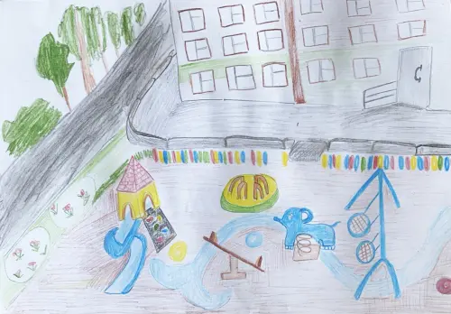 Я нарисовала свою любимую площадку, потому что она очень красивая. Я с подружками все время играю в прятки и прячусь под горкой, девочки меня найти не могут.
