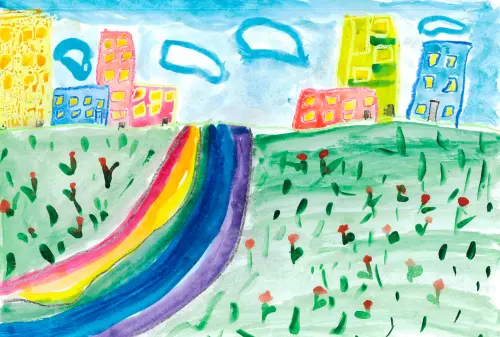 Я нарисовала то, как я вижу поход домой с прогулки летом, вокруг цветочки, красивые дома, вокруг все цветет, поют птички, и еще я очень люблю, когда после дождя видно радугу, поэтому я решила нарисовать радугу.