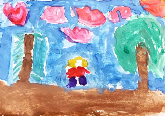Анжелика так любит кормить голубей, что решила нарисовать это в рисунке. Мы очень любим наш район и наш двор, в нем очень много зелени и детских площадок.