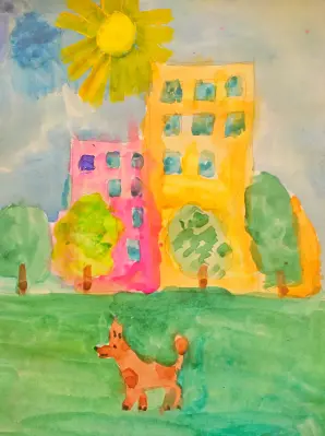 Моника нарисовала дома, улицу с деревьями и собачку, которая гуляет по улице. Сюжет и цвета она придумывала сама. Работа выполнена акварелью. Моника любит рисовать и рисовала с удовольствием, правда в конце устала.