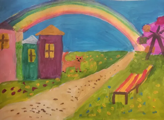 Степан нарисовал дома и дорогу, идущую в Измайловский парк, куда он ходит с родителями на аттракционы. Вдали в конце дороги видно колесо обозрения. Над городом встала красивая радуга.