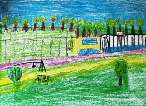 В работе представлена любимая зона для прогулок и отдыха.В работе представлена любимая зона для прогулок и отдыха, где можно провести время с пользой для здоровья. Есть и футбольное поле и баскетбольная площадка. Для ребят поменьше детская площадка с тарзанкой.