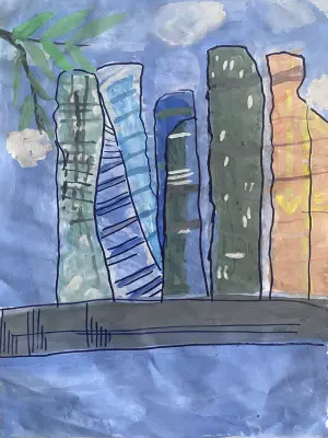 Я очень люблю гулять около Москвы-Сити. С какой стороны ни посмотреть на нее, всегда смотрится красиво, как будто город будущего. Решила нарисовать, как его вижу я.