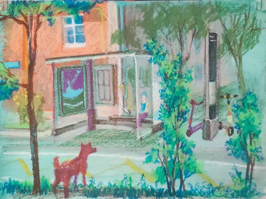Ваня нарисовал автобусную остановку. Он очень любит кататься на автобуса и смотреть в окно. Остановка находится недалеко от дома, где живет Ваня. Также Ваня нарисовал собаку.