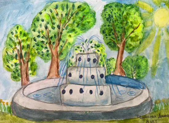 На рисунке изображен фонтан в районе Восточный. Он располагается рядом с ТУ Восточный, куда я хожу на кружки. Жители района любят это место у фонтана и часто отдыхают около него.