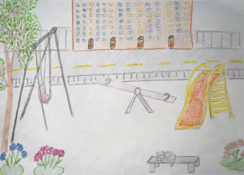 Я нарисовал свою детскую площадку, на которой я с друзьями и своей семьей гуляем почти каждый день. Она нам всем очень нравится, ну и потому что она рядом с домом.