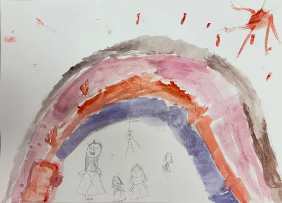 В моем дворе очень хорошо, все живут дружно и счастливо, помогают друг другу. Я нарисовала радугу, потому что она обозначает радость. Рисовала карандашами и красками.