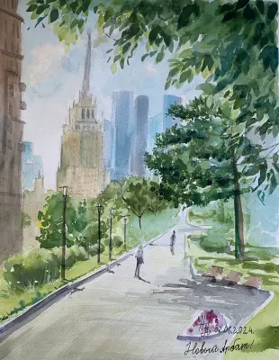 Москва меняется, пусть этот миг будет кусочком остановившегося время.Я люблю гулять по скверу на Новом Арбате. Давно хотела нарисовать этот вид. В разное время дня он разный. Я рисовала его днем.
