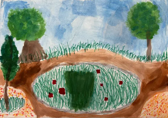Это моё любимое место прогулок, особенно такими жаркими вечерами. Там красивые старые деревья, много птиц, бабочек и, к сожалению, комаров. А зимой я играю там в снежки и леплю снежную бабу.