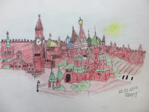 Работа выполнена по представлению после прогулки по центру Москвы и просмотра фотографий.Работа выполнена по представлению после прогулки по центру Москвы и просмотра фотографий.Работа выполнена по представлению после прогулки по центру Москвы и просмотра фотографий. Работа выполнена на бумаге ф. А3. Использовались краски гуашь.