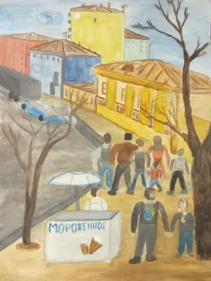 Работа выполнена по представлению и после просмотра фотографий после прогулки по любимым улицам вместе с семьей и с друзьями. Работа выполнена на бумаге формата А3, краски гуашь.