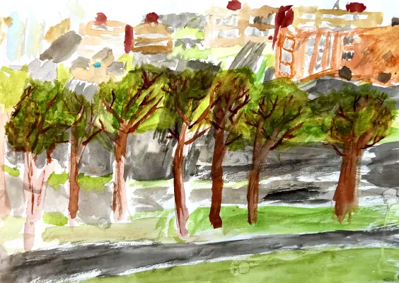 Этот вид из окна я вижу каждый за чашечкой чая. Он меня завораживает. Зимой деревья белые, осенью ярко-желтые, летом сочно зеленые, а весной ждут тепла. За деревьями идет дорога по которой туда-сюда снуют люди и машины. Я люблю свой район.