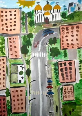 Хорошая девочка Нина на Бобруйской дом 3 живёт. Очень любит рисовать). Бобруйская улица чистая и аккуратная, со своими тихими дворами. Много новых спортивных и детских площадок. В своей работе хотела передать всю красоту любимой улицы. Здесь у меня и родной садик, куда я хожу. В этом году пойду в школу. В работе использовала акварель, много зелёного цвета… На рисунке изображён храм Иоана Русского, туда мы ходим с родителями и ставим свечи. Во дворе храма живут белки и можно на них посмотреть, а на Пасху запускали в небо шарики. Спортивная площадка где занимаются соседские мальчики и девочки. Много деревьев на нашей улице, весной цветет сирень и черемуха, летом жасмин и липа и аромат стоит по всей округе. Представляете, к нам в садик приходили белки и мы их кормили семечками и орешками, даже сделали кормушки, а так они живут в парке в конце улицы. За храмом на рисунке изображён кран, здесь скоро будет новый дом по реновации, некоторые мои друзья по садику туда переедут жить.Хорошая девочка Нина на Бобруйской дом 3 живёт. Очень любит рисовать). Бобруйская улица чистая и аккуратная, со своими тихими дворами. Много новых спортивных и детских площадок. В своей работе хотела передать всю красоту любимой улицы. Здесь у меня и родной садик, куда я хожу. В этом году пойду в школу. В работе использовала акварель, много зелёного цвета… На рисунке изображён храм Иоана Русского, туда мы ходим с родителями и ставим свечи. Во дворе храма живут белки и можно на них посмотреть, а на Пасху запускали в небо шарики. Спортивная площадка где занимаются соседские мальчики и девочки. Много деревьев на нашей улице, весной цветет сирень и черемуха, летом жасмин и липа и аромат стоит по всей округе. Представляете, к нам в садик приходили белки и мы их кормили семечками и орешками, даже сделали кормушки, а так они живут в парке в конце улицы. За храмом на рисунке изображён кран, здесь скоро будет новый дом по реновации, некоторые мои друзья по садику туда переедут жить.